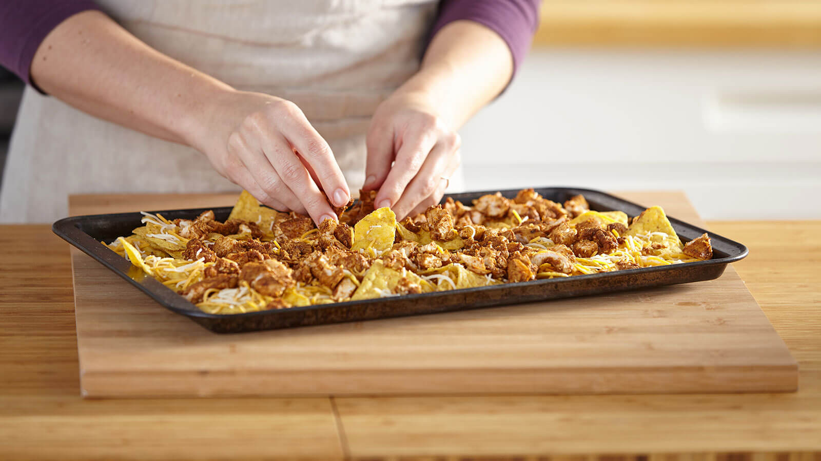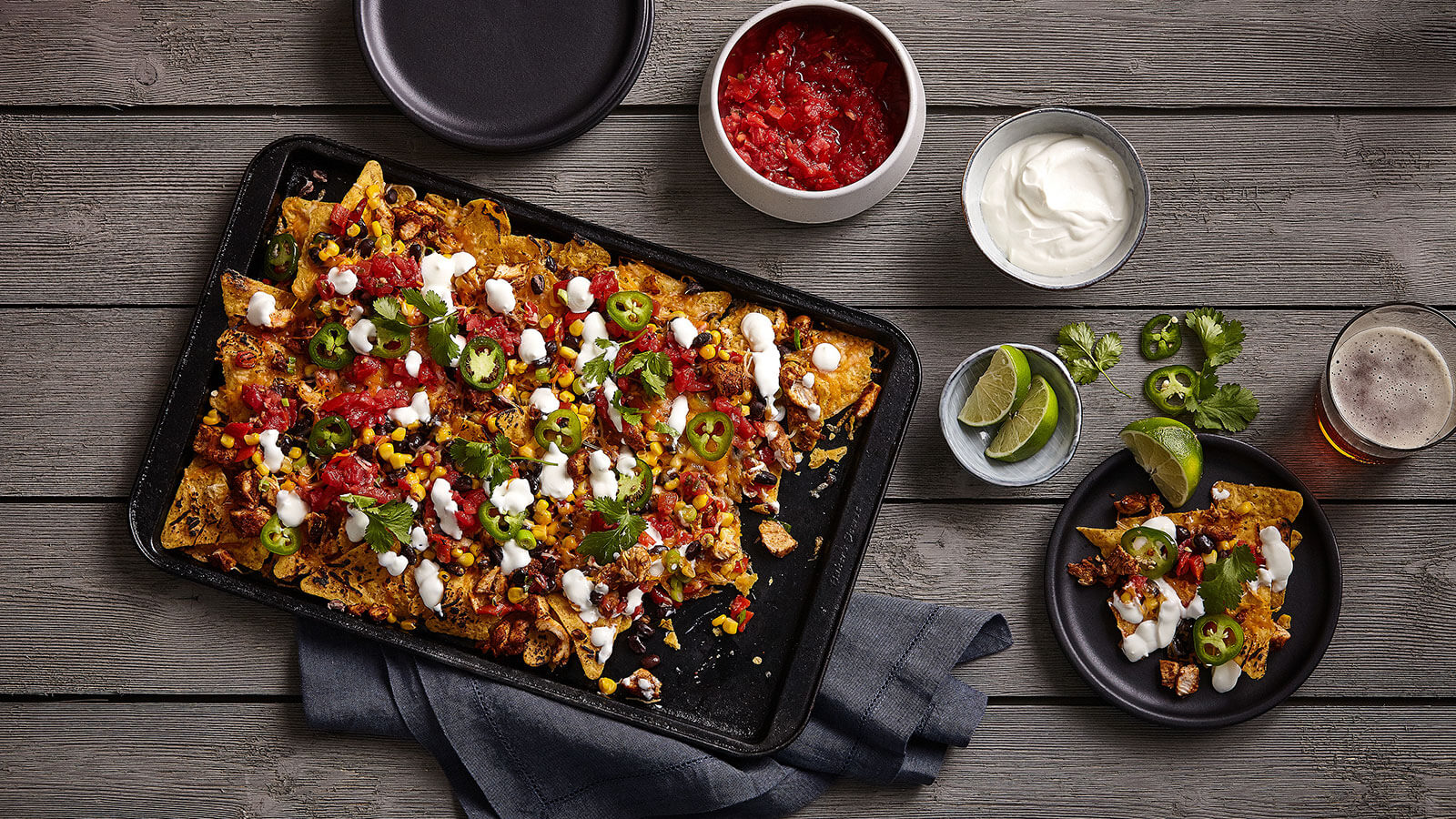Place half of the tortilla chips on a baking sheet. Top evenly with 1 cup shredded cheese. Add remaining tortilla chips, followed by chicken, remaining cheese and 1 cup Black Bean and Roasted Corn Salad.